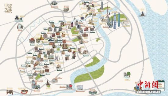地图由上海电影博物馆与大象点映旗下的Movie Land团队共同策划,由独立插画师玫瑰Rosá执笔,在真实建筑形态基础上进行艺术创作,并将相关经典电影画面巧妙植入,形成“一图一景一故事”的叙事结构。