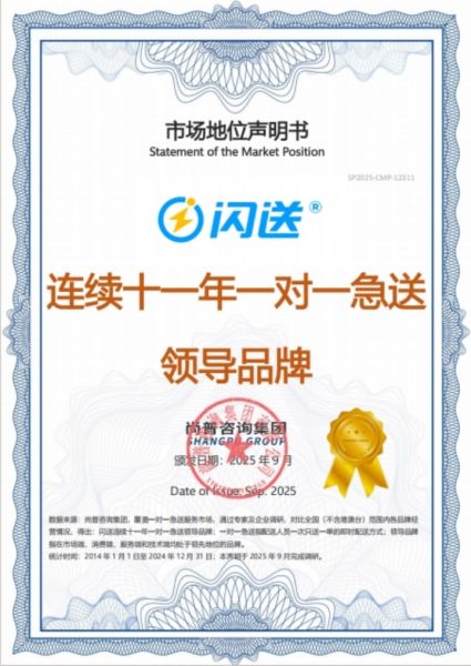 中新网上海新闻11月4日电(记者 缪璐)近日,国内领先的一对一急送平台闪送再次获得行业权威认可,尚普咨询向其颁发了"连续十一年一对一急送领导品牌"认证。这一荣誉不仅体现了闪送在即时配送领域的持续领先地位,更彰显了其独特商业模式和专业化服务形成的竞争优势。