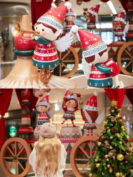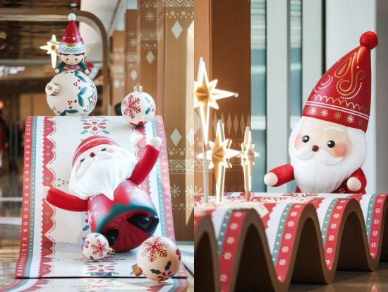 南广场20米高的可旋转主装置,通过AB双面的多样视觉和动态设计,呈现生动姿态;向内延伸至L1中庭,“嘉年华巡演营地”和“烛光音乐会”延续旋转设计语言,可爱的精灵乐手与舞者传递着童趣与温暖的节日问候;L3连廊则呈现出一条“精灵魔毯”形态的时空通道,让消费者穿行其间时,被穿越而来的精灵环绕,感受传递好运与快乐的神奇氛围;贯穿L1至L4的中庭通天柱,还原了北欧传统的积木玩具“敲敲塔”,串联起垂直空间的节日韵律,进一步推动节日氛围在全场流动。