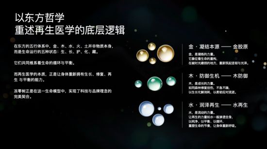 白若言表示:“在东方的五行体系中,金、木、水、火、土并非物质本身,而是生命运行的五种状态:生、长、护、化、藏。它们共同维系着生命的循环与平衡。而再生医学的本质,是让身体重新拥有生长、修复、再生与平衡的能力。冻零树正是在这个生命模型中,实现了科技与品牌理念的完美契合。”