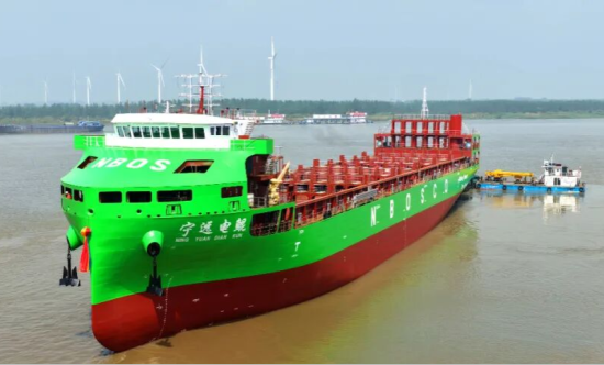 安装了七〇四所自主研制的新型纯电推进系统的全球最大、国内首制万吨级740TEU纯电动敞口集装箱船成功下水,标志着我国沿海集装箱运输将迈入“零排放、纯电动”时代。