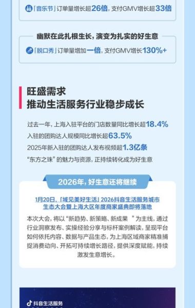 中新网上海新闻1月20日电(徐银)1月18日,抖音生活服务发布《美好城市生活图鉴》。上海凭借其国际化都市的底色与对生活品质的极致追求,在抖音将独特的生活观念、转化为了清晰的增长曲线。
