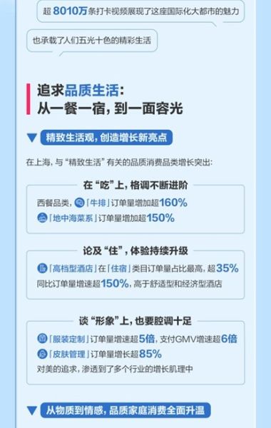 数据显示,上海的品质消费,正从个人向家庭、从外在向内在全面深化:在“吃住行”上,“牛排”“高档型酒店”等品类订单增速均超150%;在情感陪伴上,“宠物用品”订单量增长近10倍,“智能家居”增速超180%。同时,城市的快乐需求同样旺盛:“酒吧”支付GMV增长超7成,“音乐节”订单量激增26倍。从物质到精神,从个体到家庭,一张立体而精致的消费图谱,已然生成。