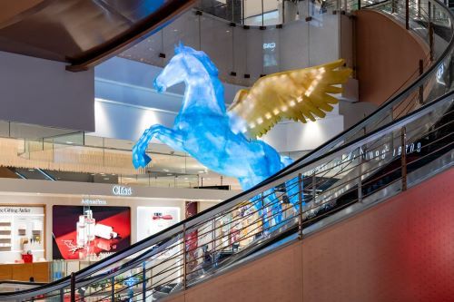 其中,南京路步行街主街金带上,三款马年主题美陈焕新亮相。幸福加“马”以爱心形生肖马搭配抖音生服爱心,传递“马上幸福、被爱环绕”的暖意;心愿加“马”融合多元元素打造游园式造型,寓意“心愿加码、所愿皆成”;好运加“马”打造 360°旋转木马梦境场景,造型巧藏宫灯古韵,承载美梦成真的期许。而新世界新丸中心打造的大型艺术装置《星翼丙午》尤为亮眼,以古籍中象征“天驷”与光明的“星日马”为原型,将星图符号转化为兼具未来感与神圣感的实体作品,成为南京路马年氛围的标志性打卡点。