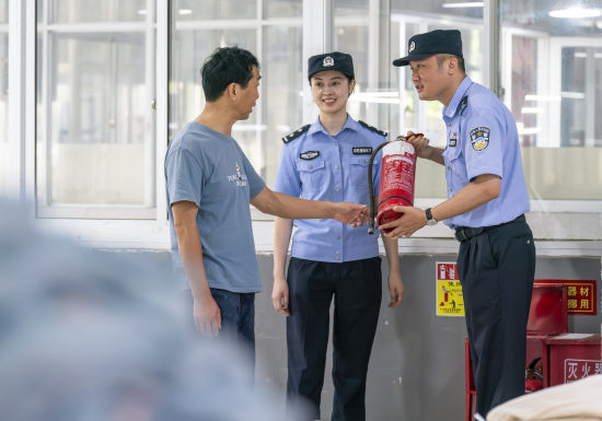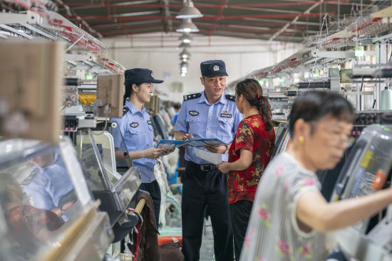 民警与企业负责人一同开展消防安全检查。沈群 摄