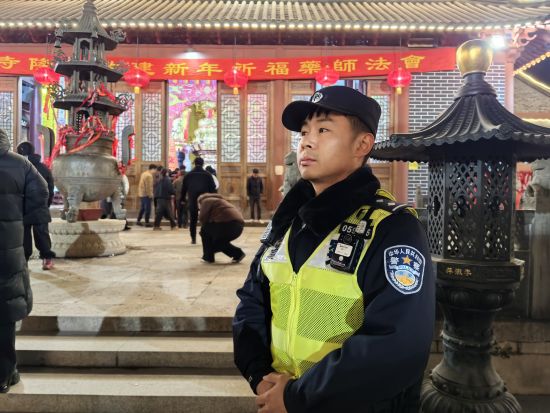 崇明分局汲浜派出所民警朱瑜琦在广福寺开展安保执勤工作。崇明警方供图