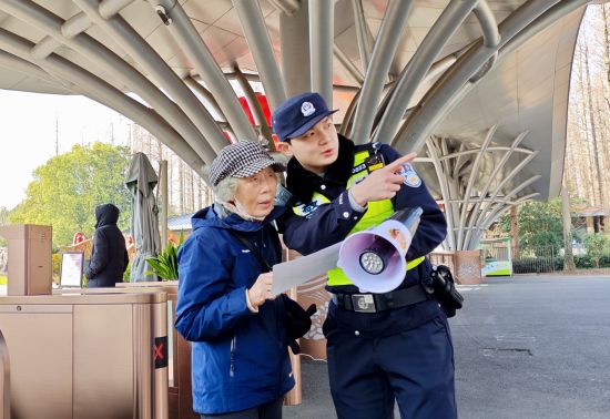崇明分局建设派出所民警黄语扉在东平国家森林公园为游客指引道路。崇明公安供图