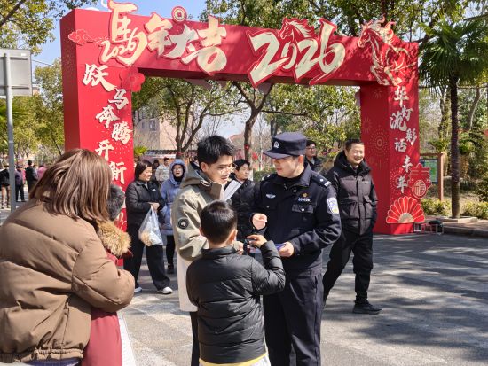 崇明分局横沙所民警郭青青在辖区新春市集开展安全宣防工作。崇明公安供图