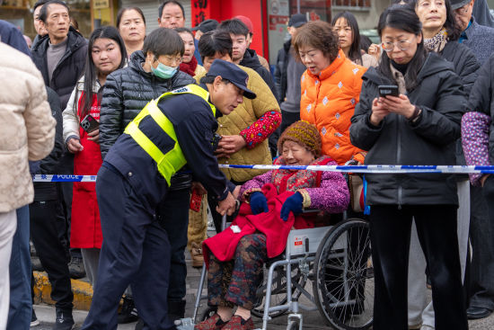 堡镇派出所民警协助行动不便的老人转移至安全区域观看表演。沈群 摄