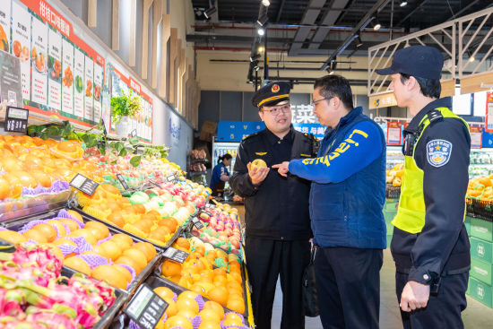 民警与市场监管执法人员在超市水果摊位开展检查。沈群 摄