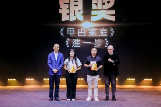 上海市人民政府台湾事务办公室副主任王立新和上海大学教授、国际策展人、We爱评委会主席马可·穆勒为“银奖”作品《曱甴家庭》《进一步》颁奖