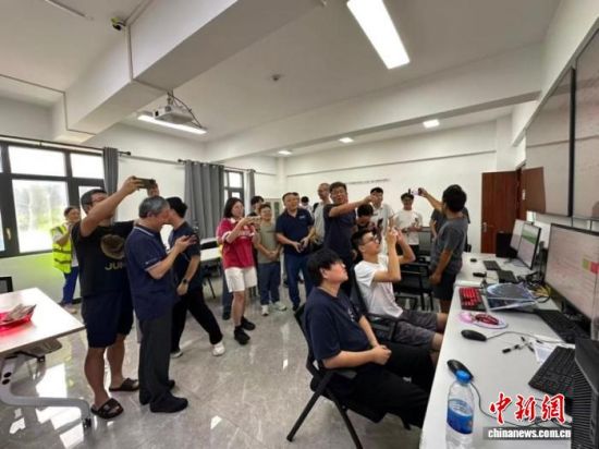 上海交大博士生李瑞(右排第一位)在完成首轮全面刻度后,代表合作组启动第一个正式物理运行数据。(资料图,上海交通大学供图)