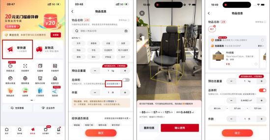 针对家具、全身镜等大件物品的“量不准”问题,顺丰推出“拍照识别体积”功能(目前该功能仅支持带激光雷达的苹果手机用户使用)。用户从顺丰速运APP点击“寄快递”,即可轻松使用手机扫描物品,完成非接触式体积测量。在测量精度方面,该功能实现了单边平均测量误差控制在10毫米以内,并基于测量结果,创新融入AR技术,实现通过AR展示物体线框,且支持拖动线框矩形,动态计算物体体积,帮助用户获取更准确的运费预估。