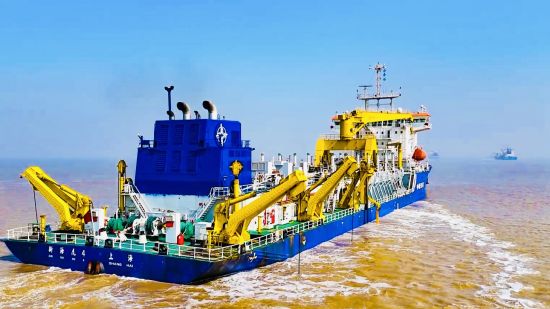 疏浚现场,五舰开足马力,全面开启“多装快跑”作业模式,昼夜不停地奋战在清淤一线。庞大的耙吸船化身海上“清道夫”,在航道内有序往返穿梭,将淤积泥沙源源不断吸入舱内并及时外运。