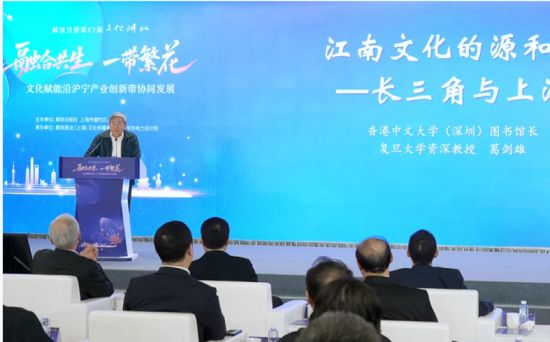 陈颂清在致辞中表示,长三角地区地缘相近、文脉相亲,沿沪宁八市一区都拥有江南文化的身份认同,新时代这份厚重绵长的文化基因必将为产业创新提供强劲的动力。解放日报文化讲坛创办20年来,始终以文化为灵魂,迎合时代的脉动,探讨时代的变迁。今天文化讲坛以“融合共生 一带繁花”为主题,正是要在这一战略高地探寻文化与创新的共生之道,让这条产业创新带上的颗颗明珠串珠成链、繁花似锦,并通过各位学者专家迸发出璀璨的思想火花,为沿沪宁产业创新带协同发展带来新的机遇。