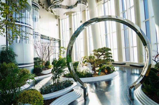 观光厅区域从55层到58层,包含室内和室外观景台、会议厅等区域,融观光、会展、文化体验与社交功能于一体,每层空间都有明确的主题定位与功能划分。其中,55层以碳中和为主题精心打造了环保展览装置,将生态理念巧妙融入观光体验,为高空观光增添了全新的内涵。57-58层为户外观景台,以冰山为设计灵感,在户外平台上融入中国传统计时工具日晷的形态元素,构建出兼具艺术美感与文化象征的观景空间。