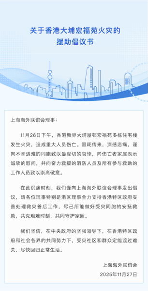 上海海外联谊会发出《关于香港大埔宏福苑火灾的援助倡议书》