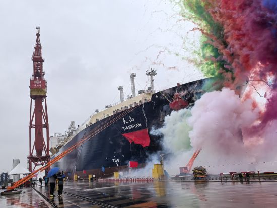 此次交付的LNG运输新造船“天山”轮由沪东中华建造,采用了全球最新一代双燃料低速推进动力系统,单日航行碳排放相比传统燃油驱动减少10吨以上。该船总长295米、宽45米,甲板面积相当于3个标准足球场大小。这条船配备了全球领先的液货围护系统,能够在零下163℃的低温下装载液化天然气安全航行。