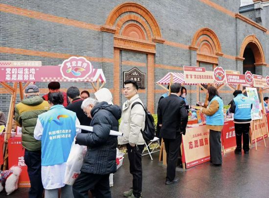位于中共一大纪念馆国旗广场和兴业路沿街的志愿服务集市人头攒动。来自好八连、武警上海总队执勤第四支队十中队、中共一大纪念馆、全市性行业协会商会、区志愿服务工作协调机制成员单位、区志愿者协会等50余个志愿服务队伍围绕服务国家战略、服务百姓民生、服务社会治理,为市民游客提供人民城市讲述、理发、健康咨询、法律咨询、应急救护、环保宣传等集中性便民服务。