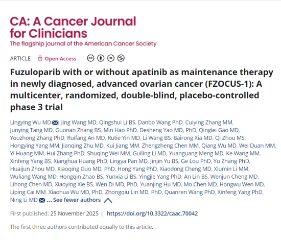日前,我国卵巢癌领域重磅临床研究FZOCUS-1研究全文在医学领域超顶级期刊《CA: A Cancer Journal for Clinicians》(简称 CA,影响因子 232.4)线上发表。这是该期刊首次发表中国卵巢癌领域临床研究,也是创刊以来发表的全球第二篇临床试验研究论著,标志着我国在 “妇科癌王” 精准治疗领域的突破获国际权威认可,也为全球卵巢癌患者带来更优生存的新希望。