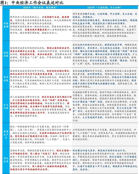 第一,政策基调偏温和,聚焦内部形势和中长期问题。总体基调由2024年底经济工作会议的“稳中求进,以进促稳、守正创新”,转变为“坚持稳中求进、提质增效,发挥存量政策和增量政策集成效应”。表态上偏温和,预计2026年宏观政策有望延续2025年基调,整体积极,但也不会大水漫灌强刺激。