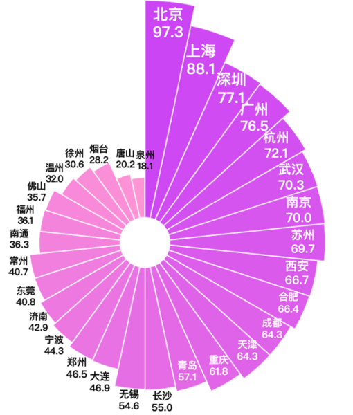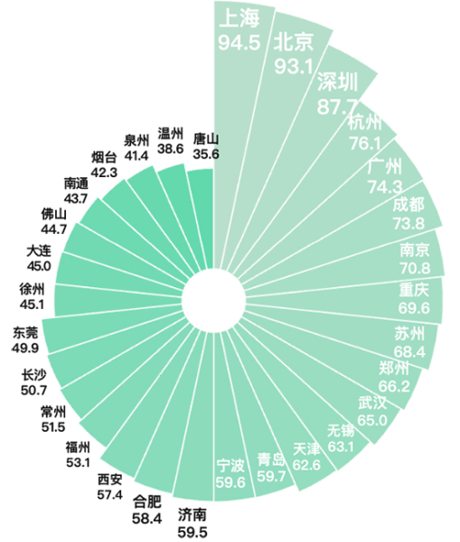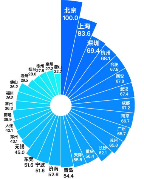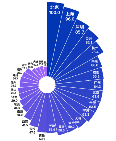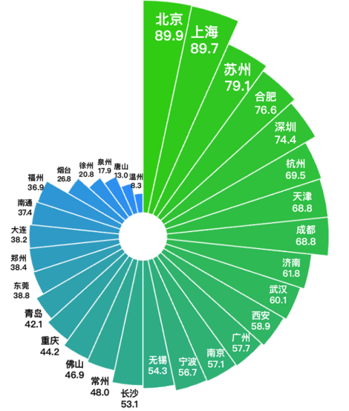 从产业硬核分指数看,首先,北京微弱优势领先上海,双城旗鼓相当,海在科创板上市企业、国家企业技术中心等方面总体领先,北京在战兴集群占比、未来产业揭榜挂帅项目方面保持领先;其次,苏州产业实力突出,合肥表现亮眼,苏州在科创板上市企业,国家企业技术中心方面优势突出;合肥在新兴产业领域加速崛起,未来产业揭榜挂帅居于领先,显现较强的未来产业发展潜力;最后,徐州、泉州、唐山、温州等城市相对滞后,产业硬核能力差距明显,为保持持续的经济实力,需要加快面向新兴产业和未来产业的产业转型。