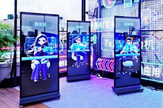 展厅里,五彩斑斓的“AI货架”展示了多款AI STORE深度赋能业务的“拳头产品”:比如,可以让文档变知识的“晓悟”企业智能知识库、将招聘效率提升300%的“晓招聘”智能招聘助手,以及随时随地可办公的“AI云电脑数字工位”……