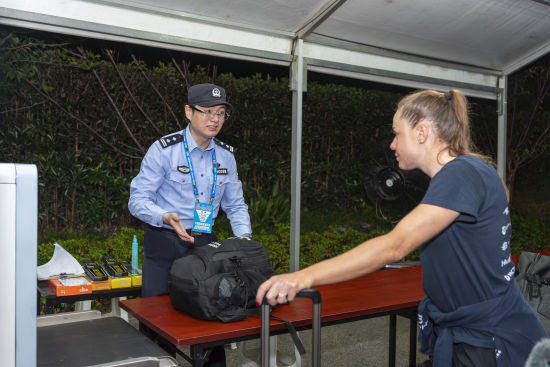 10月11日晚,民警为入住酒店的运动员开展行李安检工作。沈群 摄