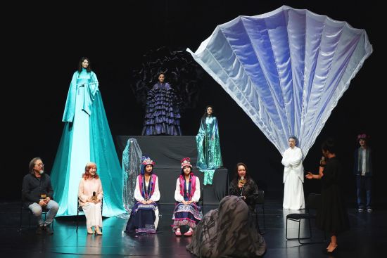 在工业化生产普及的当下,剧场艺术仍坚守着 “手工业” 的独特基因,这份匠心在此次发布会的服装设计与舞台呈现中都展现得淋漓尽致。从面料甄选、剪裁塑形到纹样缝制,每一道工序都凝聚着细腻巧思,每一针一线都不断打磨。在实际试装排练时,黄薇也亲临现场,实时调整细节处,力求达到最佳的舞台效果,一个微小的调整却能达成巨大的增效,令演员和制作人员都惊呼不已,尽显她精准独到的艺术把控力。