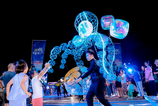 入夜时分,作为本次嘉年华的“王牌亮点”,大型木偶巡游“海洋奇缘”——也开始了全球首演。上海木偶剧团为今年的炫偶嘉年华特别定制了这场奇幻巡游秀,突破传统木偶形式,探索大型户外木偶的奇幻性与装置感。鲸鱼、章鱼、水母等灵动发光的“海洋生物”穿梭人群,把深海世界搬到你的眼前,呆萌的企鹅热情与观众互动,荧光勾勒的海洋生物木偶在夜色中亮起,瞬间带观众坠入神秘的“海底艺术幻境”。