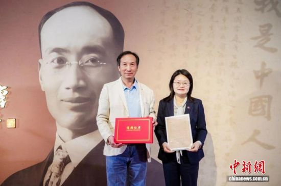 10月22日,“爱国赤子 新闻巨擘——戈公振135周年诞辰纪念展”开幕式在中国近现代新闻出版博物馆举行。图为戈公振侄外孙孙戈(左)向中国近现代新闻出版博物馆捐赠有关戈公振的信件。 (中国近现代新闻出版博物馆供图)