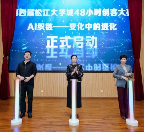 沈艺、费薇、姜山共同上台,启动第四届松江大学城48小时创客大赛。