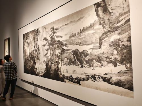 本次《时至骨自换》特展,以山水画数量最多,其中两幅2米乘5.5米、一幅1.6米乘3.2米的巨构《移居图》《寒山金阙》和《翠峰迎辉》尤为引人注目。苏小松以当代绘画的视野重新精彩地观照、接续、再现了宋人山水的文脉。