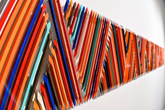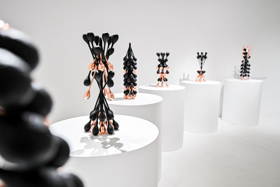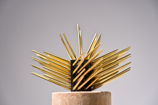 2024年新作《323根刺》以铝制基底承载323根黄铜尖刺,精密螺丝固定的可拆解结构,暗喻“文明秩序的脆弱性”;《垂直花园》中悬挂如“果实”的圆形单元,模拟出植物垂直生长的自然韵律,实现人工秩序与自然意象的交融;《二百六十四滴泪》则将情感符号“眼泪”转化为工业模块,玻璃涂层折射的微光,打破“金属无情感”的刻板印象。这些作品以工业材质为载体,以“对称秩序”与“物质美学”为核心,既展现艺术创作的细节质感,更传递对“人工与自然”“个体与集体”的深层思考。