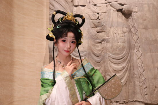 11月8日,五位高颜值汉服爱好者亮相云冈石窟艺术特展国风音乐季活动现场,在“第十二窟”内进行流动巡演。当衣袂飘飘的身影穿梭于千年石窟的复刻空间,与壁上的“天宫乐伎”浮雕相映成趣,营造出“仙人如画,步入石窟”的梦幻场景。她们与观众即兴互动、合影留念,进一步增强现场的沉浸感与参与感。