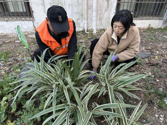 活动当天上午,大自然保护植物共建区第一期修整工作率先展开。该区域自2024年9月建成以来,经过一年多的自然生长,出现植物杂乱、边界不清等问题。上房园林植物研究所联合三名居民志愿者、居委会及物业团队,通过专业园艺操作,恢复了原生植物的生长秩序。