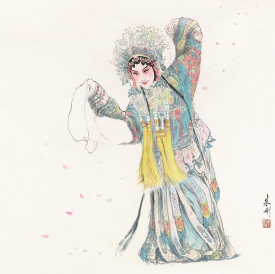 为了把戏画画好,朱刚当真成了戏迷。很长一段时间,他平均每周看三回戏,怀揣铅笔速写本天天出入剧场的台前幕后,看戏时着意捕捉最触动人心的一瞬间,深入排练场则留心勾画头冠、服饰、化妆、道具等细节,向演员们讨教戏曲的一招一式。“只有看戏、知戏、懂戏,才能画好戏。”“千百年来,戏曲引导着一股向善的力量,我想用画笔表达蕴含其中的传统文化。”朱刚说。