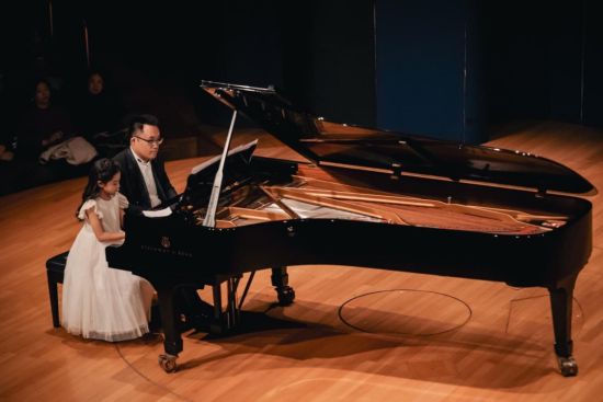 演出中,不同年龄段的学生们依次登台,展现出音乐学习路上的成长足迹。五岁的韩曜安以童真演绎布格缪勒《叙事曲》;陈哲成在拜厄练习曲中展露扎实功底,并演奏小提琴与陈老师的钢琴合作呈现维瓦尔第《a小调协奏曲》;蔡逸宸则穿梭于柴可夫斯基《船歌》的诗意与尤曼斯《鸳鸯茶》的轻快之间,展现出音乐理解的广度。