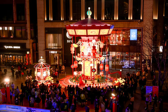 BFC风尚潮流灯区联合泡泡玛特打造潮流年味新体验,推出新春游园会。BFC北区广场,一座别出心裁的宫灯旋转木马装置点亮:传统宫灯的“朱红飞檐”下,暖黄灯箱勾勒出12个泡泡玛特经典IP形象,宛如将童话藏入中式画框;下层木马在光影中交织出马年的奔腾意象与喜庆的年节氛围;宫灯一侧,LABUBU的萌趣灯组与旋转木马相映成趣。
