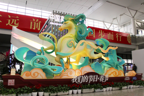 游戏中的“马型霄灯”突破次元壁来到车站,为旅行者送上“马踏祥云,一飞冲天”的美好祝福