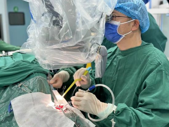 面对这一棘手病例,高亮教授团队制定了“风险分层、精准控制”的诊疗策略,决定分两阶段实施手术。首先由神经介入团队进行血管栓塞术,盖延廷主任历时8小时,注入26支医用栓塞胶,有效阻断了肿瘤的血供,为后续切除手术打下坚实基础。
