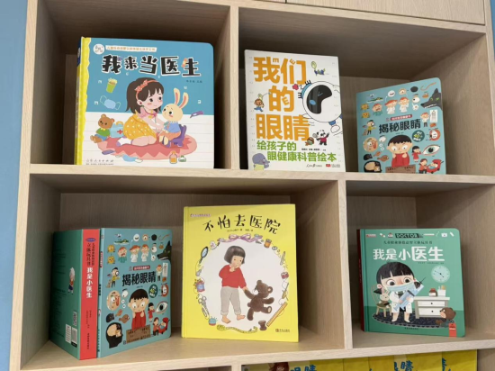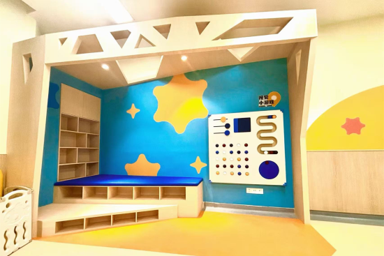 走进位于上海市第一人民医院眼科中心的“瞳·乐园”,率先映入眼帘的是不同于医院传统冷色调的活泼色彩,明亮的蓝色、温暖的黄色、活泼的橙色互相交织,墙壁上扑闪着大眼睛的可爱卡通形象瞬间吸引了孩子们的视线。房间一侧的“小型游乐区”和“迷你露营地”则兼具了娱乐、休息和阅读的功能:书架上放置着几排眼健康为主题的科普绘本;墙壁上设置了多种符合儿童视觉发育特点的玩具和装置——这些设施不仅能够吸引儿童的注意力,转移其对检查治疗的恐惧,更能在游戏中潜移默化地起到视觉训练的作用。据介绍,整个空间设计充分考虑了儿童的心理特点,力求通过视觉环境的优化,将他们对医院的“白色焦虑”转化为对“彩色乐园”的期待与好奇。
