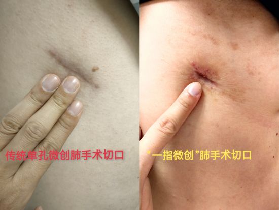 “传统的单孔胸腔镜手术通常需要1个4厘米的切口,超细胸腔镜提供了更佳的视野,而超细的器械则允许我们在如此狭小的空间内进行精准的解剖、分离和切除操作。”黄可南教授为记者分享了一个病例,并介绍,“我们这次利用特制的更精细的腔镜器械,将操作切口优化至仅约一指宽。对于不同结节位置的患者还可以选择在更加隐蔽的腋下或乳晕等区域。”