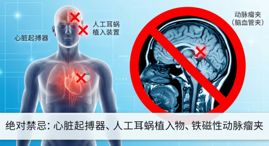 MRI设备磁场强度极高,1.5T设备约为地球磁场的3万倍,3T设备达6万倍,铁磁性物品会被强烈吸引产生“导弹效应”,造成人身伤害和设备损坏,因此MRI检查有严格的禁忌症和安检要求。体内有心脏起搏器、人工耳蜗、铁磁性动脉瘤夹、眼内铁磁性异物,以及植入某些早期铁磁性金属植入物者严禁做MRI检查。进入扫描室前,首饰、带金属配件的衣物、钢圈内衣、手机、钥匙、假牙、助听器、含金属丝的假发等必须去除;含金属微粒的化妆品需卸妆;纹身因颜料可能含金属,需提前告知医生。妊娠早期一般不建议检查,妊娠期避免使用钆对比剂;幽闭恐惧症患者可预约开放式设备、使用抗焦虑药物、佩戴耳塞等方式缓解,部分医院允许家属陪同;严重肾功能不全者避免做增强 MRI,防止引发肾源性系统性纤维化;体内有金属植入物者,需确认材质(现代钛合金骨科内固定物多可检查),并向医生提供相关资料;推车、拐杖等大型金属物品,严禁进入磁体间。