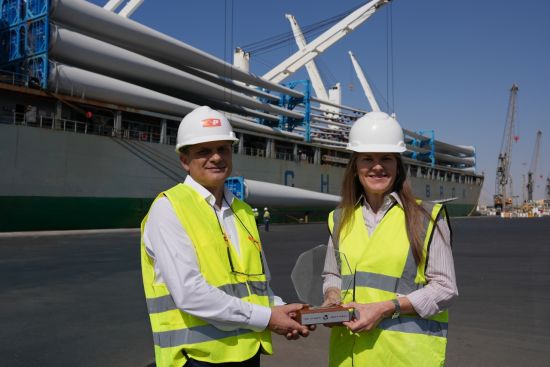 当地时间10月27日,在新未来城港皮莱茨基轮泊位边举行仪式,公司项目团队和港务局负责人、收货人一同见证船舶卸载第一件风叶。皮莱茨基轮船长诺伯特·科尔夫赞接过港口赠送的完货纪念杯,标志沙特新未来城绿色氢工厂风电海运项目圆满交付。据介绍,最后一船设备于今年中国国庆假期期间间从中国太仓码头起程,一共6套风车叶片、主机轮毂和塔筒。