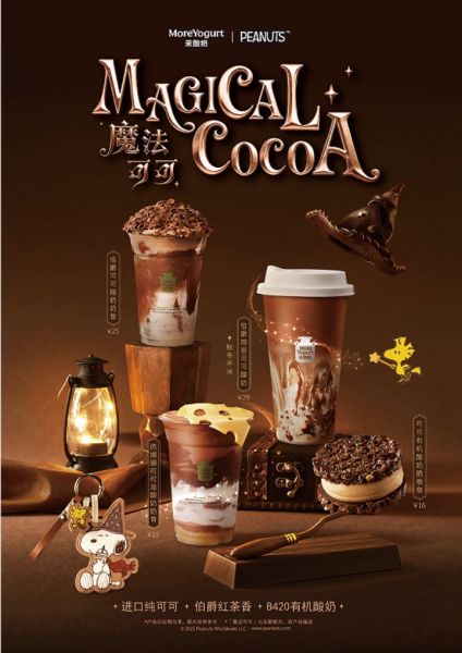 近期,茉酸奶与花生漫画的联名在社交平台掀起打卡热潮,其“Magical Cocoa”主题的饮品及限定周边,不仅是网友拍照打卡的氛围感搭子,更唤醒了大家的童年记忆。当人们驻足门店前,手持印着史努比的饮品,消费的不只是一杯酸奶,还有那份被瞬间激活的集体回忆与治愈感——因为“幸福是一只温暖的小狗”。