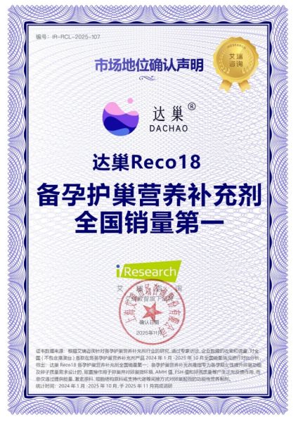 中新网上海新闻12月17日电(记者 缪璐)近日,经第三方权威机构艾瑞咨询全面调研认证,医研共创品牌达巢旗下核心产品达巢Reco18,正式荣膺该产品领域“全国销量第一”的称号。这一认证不仅是对达巢Reco18市场表现的肯定,更标志着其在产品品质与用户认可度上,已跻身行业头部阵营,为备孕营养补充剂市场树立了新的价值标杆。