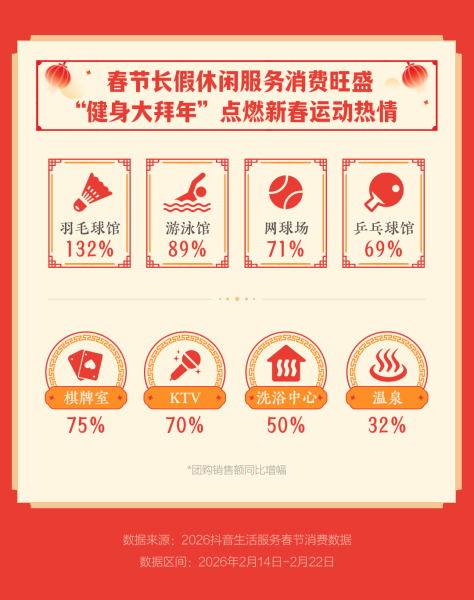 同时,休闲消费与品质消费同步升级。数据显示,春节期间足疗按摩、商超购物券、黄金、灯会庙会等品类团购订单量涨幅也均超60%。长假期间,“健身大拜年”点燃新春运动热情,羽毛球馆、游泳馆、网球场、乒乓球馆团购销售额同比分别增长132%、89%、71%和69%。棋牌室、KTV、洗浴中心、温泉等休闲娱乐场所的销售额也分别增长了75%、70%、50%和32%。购物休闲与运动健身相结合,不断丰富大众欢度新春的消费选择。