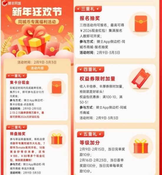 此外,顺丰同城在2026年春节期间特别推出总价值超20万元的新春专属福利活动,涵盖幸运大转盘、千人组团抽大奖、集卡分现金、公众号互动抽奖等多种形式,并提供商城钜惠等实用福利,让骑手在春节期间获得更多奖励与实惠。除了直接的经济激励,顺丰同城还在春节期间推出“免罚挑战”,骑手通过完成相应任务挑战,即可免除近期订单扣罚。