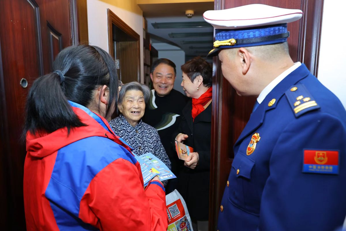 1月19日下午,在普陀区象源丽都小区,公安、民政、街道、居委、电力、燃气等工作人员分组对小区重点关爱人群家庭开展上门入户宣传服务,递送安全宣传资料,开展安全用火用电用气提示,置换不符合安全标准和老化的插线板等。工作人员提醒重点关爱人群,要安全使用电热毯,使用电热取暖器时要远离可燃物,不在电热取暖器上烘烤衣物,电动自行车不得入室停放充电,切记厨房用火不离人,不要卧床吸烟。对年纪特别大的老人,还主动开展关爱帮扶,帮忙查看电气线路和燃气灶具是否符合安全要求,帮助清理楼道、阳台和厨房的可燃杂物。